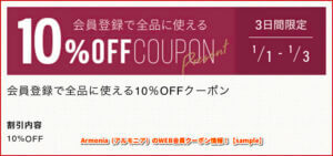 - 全品10%OFF(会員登録特典)などがArmonia(アルモニア)のクーポン情報として配信中です。