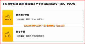 - 焼き餃子半額・現金払いで10%OFF・500円OFF(抽選クーポン)などがSUNAMO(スナモ)のクーポン情報として配信中です。